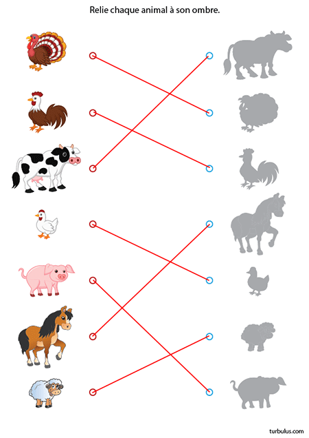 Fiche 13Jeu gratuit à imprimer pour enfants de 3-4 ans :Relie chaque animal de la ferme à son ombre.