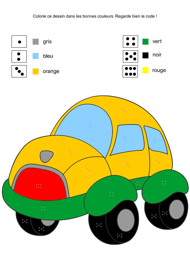 Fiche 14 ; coloriage codé à imprimer Utilise les bonnes couleurs pour colorier cet avion. Regarde bien le code. Ce jeu permet d'apprendre à combiner les couleurs et les quantités jusqu'à 6.