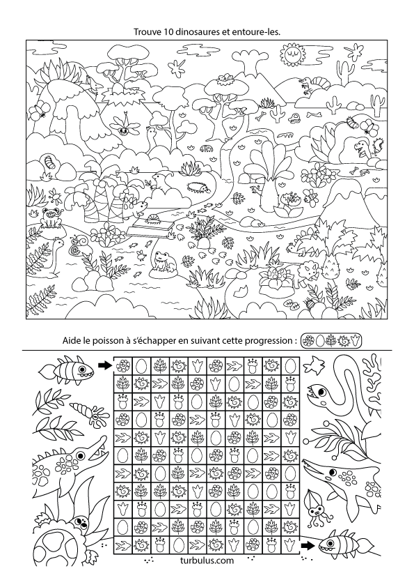 Fiche de jeux d'observation à imprimer sur le thème des dinosaures, conçue pour les enfants de 4 à 7 ans :