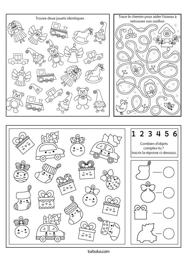 Fiche de jeux à imprimer sur le thème de Noël, conçue pour les enfants de maternelle et CP :