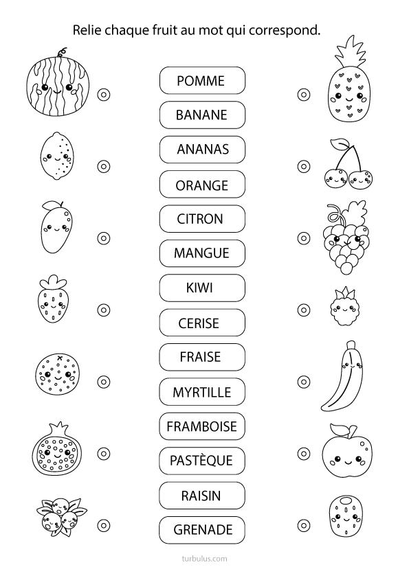 Exercice de vocabulaire à imprimer qui consiste à relier chaque fruit au mot qui correspond.